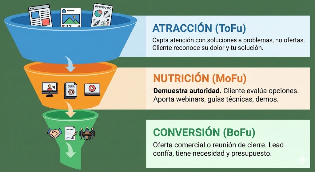 Nutrición (MoFu – Middle of Funnel): En esta etapa demostramos autoridad. El cliente ya sabe que tiene un problema, ahora está evaluando quién es el mejor para resolverlo. Aquà aportamos webinars, guÃas técnicas o demos.